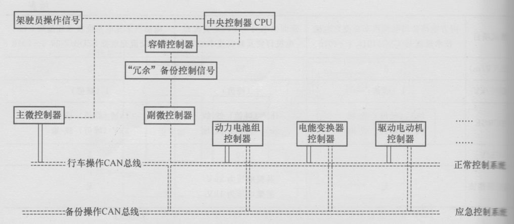 為了防備電動汽車的微控制器或電路因受干擾、老化或損傷而失效,引發(fā)電動汽車運行過程中發(fā)生事故,現(xiàn)代電動汽車上采用容錯控制器以實現(xiàn)容錯功能,容錯控制器一般采用冗余處理策略,即是在電子電器控制系統(tǒng)中,裝置一個主微控制器,并備份一個備用副微控制器,副微控制器具有主微控制器的基本功能,并對主微控制器有檢測的功能。一旦主微控制器發(fā)生故障,副微控制器立即“接管”主微控制器全部功能,保證電動汽車不至于陷入失控狀態(tài)而造成事故或損傷。容錯控制器發(fā)揮出“失效安全”(fail-safety)的作用。副微控制器可以重新啟動主微控制器,檢測其是否能夠恢復(fù)全部功能,還可以檢測出主微控制器是否損壞,以及實時取代主微控制器進(jìn)入狀態(tài)。保證了電動汽車不會出現(xiàn)“死車”,而能夠維持返回或開到維修廠。采用“冗余”結(jié)構(gòu)的容錯控制器的容錯系統(tǒng)如圖5-39所示。