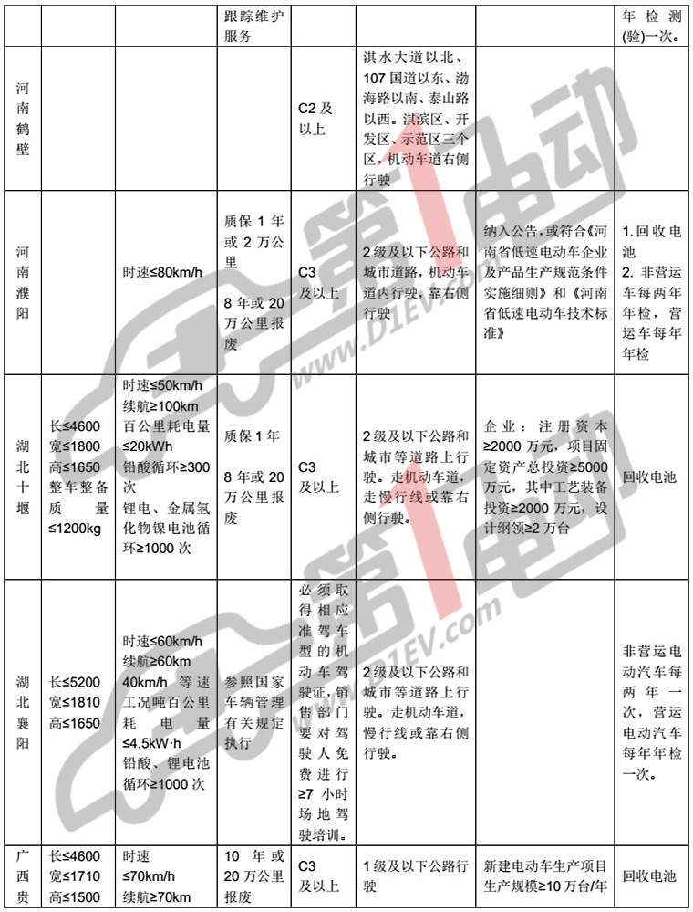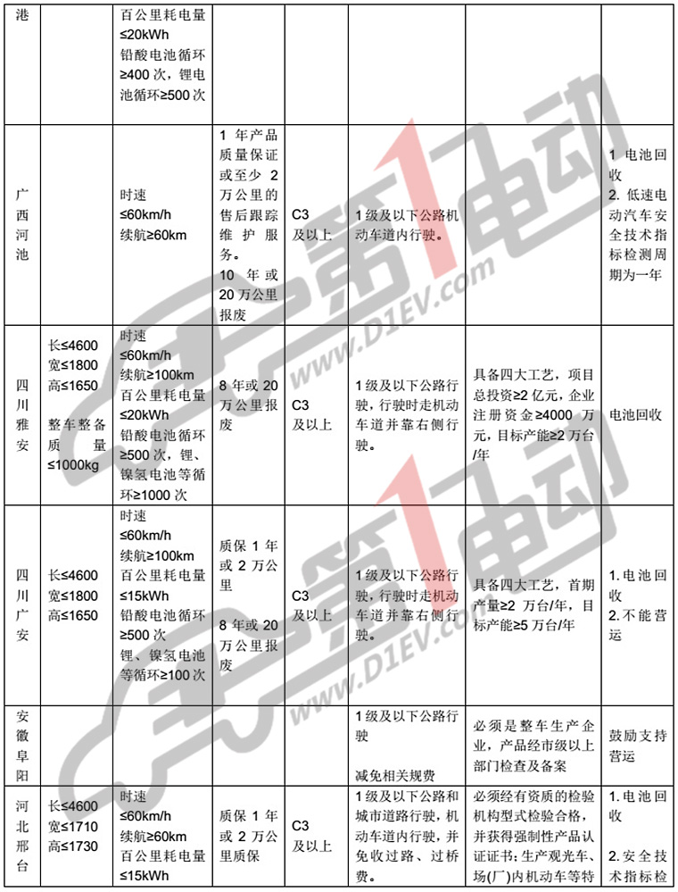 分析總結(jié)已出臺的地方管理政策,各地對低速電動車的管理越來越嚴格,全面。對企業(yè)的備案管理中,越來越多的城市提出了制造工藝、投資規(guī)模、產(chǎn)能規(guī)模、資質(zhì)等方面要求。對于產(chǎn)品方面,各地對時速、續(xù)航、尺寸大小的要求不盡相同,縱觀目前市場上主流的低速電動車產(chǎn)品,大多能滿足這些要求。有一定難度的在于百公里能耗及電池循環(huán)次數(shù)。高如湖北襄陽要求鉛酸電池循環(huán)次數(shù)不低于1000,其他城市大多數(shù)要求循環(huán)次數(shù)不低于500次。年檢、質(zhì)保、報廢期的要求也能規(guī)范產(chǎn)品安全。在駕照方面,絕大多數(shù)城市要求的是C3牌照,山東聊城、河南商丘等少數(shù)城市要求C2牌照。路權(quán)方面,“一級及以下公路(城市)道路行駛”的規(guī)定居多,少數(shù)要求二級及以下。